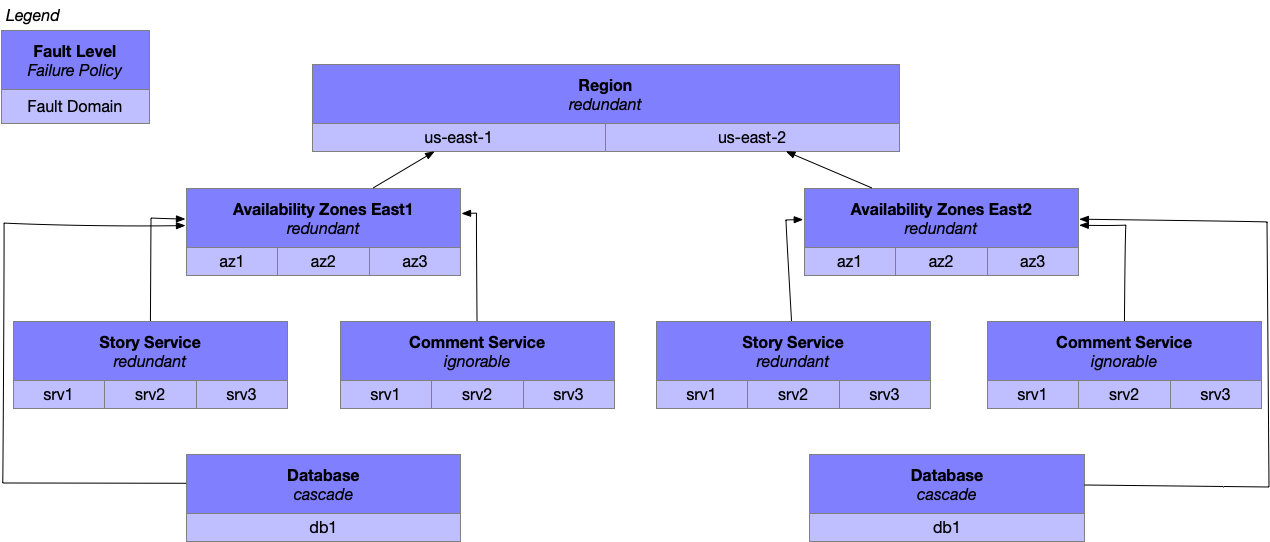 - redundant means that fault domains within the level can take over responsibility for a failed domain's responsibilities. Some examples here are nodes in a Cassandra or Memcache cluster, or an architecture design that supports the loss of an AWS Availability Zone. (With one or fewer health domains in within a redundant level, it follows the behavior described below under the cascade policy.)