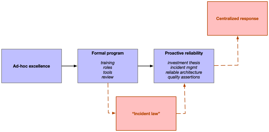 As important as it is to escape this “form over function” approach, it’s not quite enough on its own. You also need to evolve from reactively investing in reliability to an approach that supports proactive investment. Unlike the previous phases, there is no organization size threshold you need to reach before you can leave incident law behind you, rather escaping these legalities is a matter of changing your perspective: sooner is much better than later.